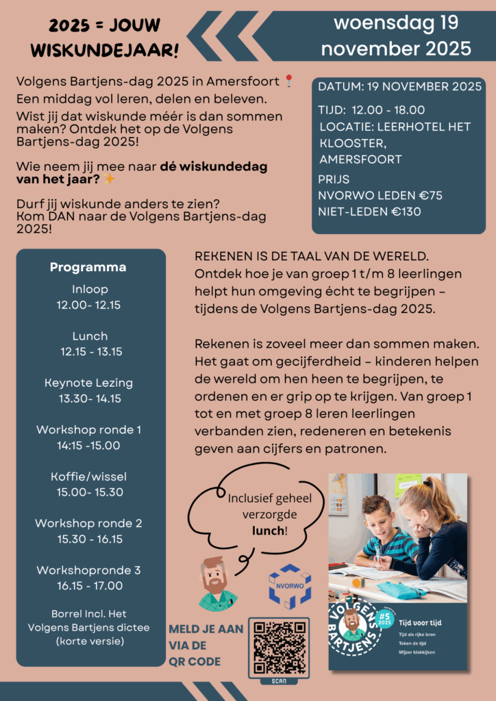 Op de Volgens Bartjens-dag 2025, georganiseerd in samenwerking met Van Gorcum, staat dit centraal. De workshops zijn erop gericht om jou als leerkracht, rekencoördinator of onderwijsprofessional praktische handvatten te geven: hoe maak je van rekenen een krachtige manier om leerlingen sterker in de wereld te laten staan?